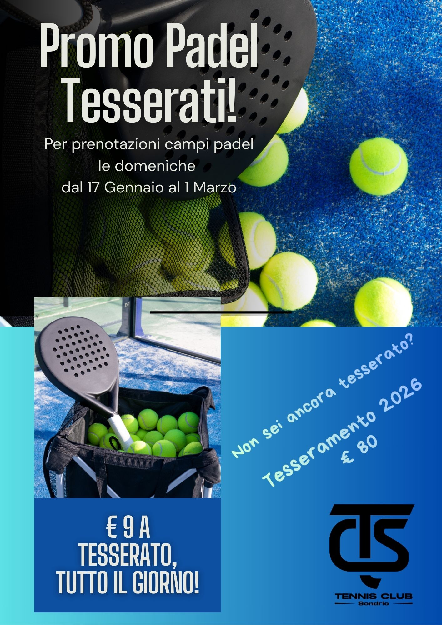 | CORSO ADULTI PADEL FEBBRAIO 2025 E’ in partenza un nuovo corso adulti di padel. DATE: dal 3 al 28 febbraio, nelle giornate di lunedì, mercoledì e venerdì – in gruppi di 3 o 4 persone, a seconda dei livelli – un’ora e mezza a settimana per n. 4 lezioni – dalle 17 in avanti. Nelle giornate di lunedì e venerdì è possibile scegliere di fare un pacchetto di n.15 lezioni invece di 4 (in tal caso il corso inizierà il 3 febbraio e terminerà il 28 maggio). COSTO: - n. 4 lezioni gruppo di 4: €104 come affiliato (+ € 80 tesseramento padel con scadenza 31/12/25 con il quale si hanno riduzioni su lezioni, partite guidate e ore campo) oppure € 140 come non affiliato - N.4 lezioni gruppo di 3: € 124 come affiliato (+ € 80 tesseramento padel con scadenza 31/12/25 con il quale si hanno riduzioni su lezioni, partite guidate e ore campo) oppure € 164 come non affiliato - n.15 lezioni gruppo di 4: € 375 come affiliato (+ € 80 tesseramento padel con scadenza 31/12/25, con il con il quale si hanno riduzioni su lezioni, partite guidate e ore campo) oppure € 495 come non affiliato - n. 15 lezioni gruppo di 3: € 450 come affiliato (+ € 80 tesseramento padel con scadenza 31/12/25, con il con il quale si hanno riduzioni su lezioni, partite guidate e ore campo) oppure € 585 come non affiliato RICHIESTO CERTIFICATO MEDICO PER L'ATTIVITA' NON AGONISTICA Se interessato comunica la tua partecipazione via email a tcsondrio@gmail.com oppure via Whatsapp al 3248759933. Alla chiusura dei gruppi ti confermeremo la quota relativa (i gruppi vengono fatti per livello, può capitare che ci siano dei gruppi da 3 persone). Se sei nuovo, registra i tuoi dati a questo link https://tennisclubsondrio.prenotatennis.it/it/prenota/?_a=primopob.registra_privacy e invia una copia del certificato medico non agonistico. Ricordiamo che eventuali assenze non si potranno recuperare Materiale fornito dal Circolo. A presto! TC Sondrio |