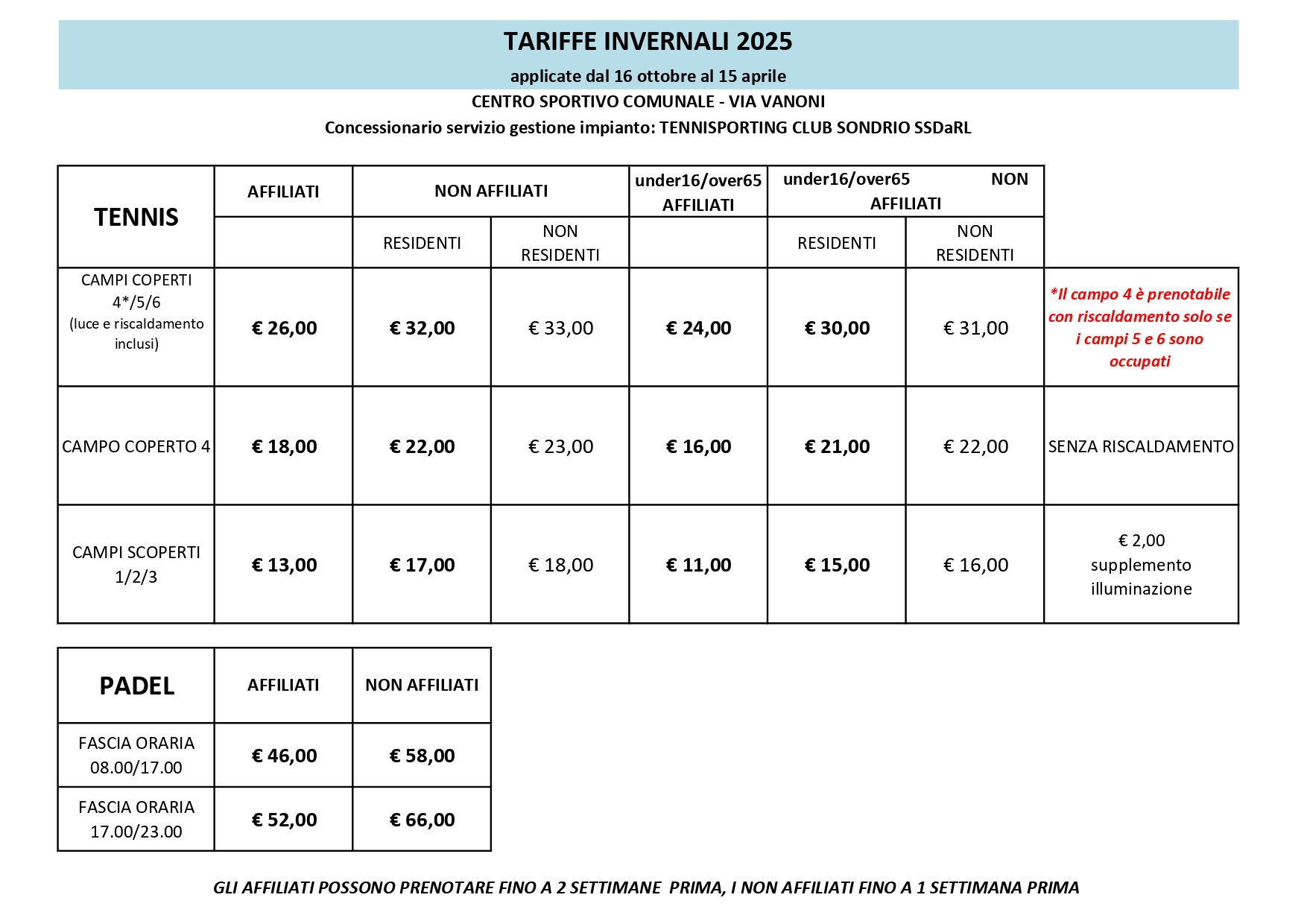 | Si comunica che dal giorno 4 ottobre 2022 apriranno i nuovi campi Padel, contrassegnati come campo Nr. 7 e campo Nr. 8. Per le prenotazioni è necessaria l’iscrizione sul nostro portale : tennisclubsondrio@prenotatennis.it ed inviare un certificato medico all’indirizzo mail: tcsondrio@gmail.com. Sul campo 7 si potrà prenotare dalle ore 08.00 alle ore 23.00 ad intervalli di 1 ora. Sul campo 8 si potrà prenotare dalle ore 08.00 alle ore 23.00 ad intervalli di 1 ora e mezza. E’ possibile il noleggio della racchetta . Per effettuar e la prenotazione è sufficiente registrarsi gratuitamente, seguire le istruzioni e dotarsi del credito minimo necessario per il pagamento. Il credito può essere effettuato tramite carta di credito o circuito PayPal direttamente nel sito internet alla voce ricarica, oppure in Segreteria in contanti, Bancomat o con carta di credito. Per agevolare l’utenza nelle prenotazioni è operativo presso il Bar Tennis uno sportello automatico per le prenotazioni, con possibilità di pagamento/ricarica conto online con banconote e monete. Non sarà possibile la prenotazione sia online che telefonica qualora non ci sia credito sufficiente sul conto e manchi il certificato medico. Il personale della segreteria è comunque a disposizione per chiarimenti tutti o giorni dalle ore 09.00 alle ore 12.00 e dalle 14.00 alle 16.00 anche telefonicamente al numero 0342 510823. In allegato Tariffe prenotazione Campi Padel. |